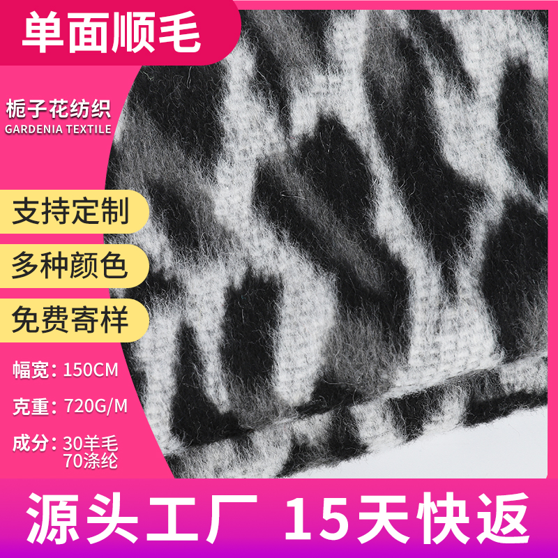 首页 > 面料 > 供货 > 无锡栀子花纺织科技有限公司-30羊毛黑白豹纹单面顺毛呢面料