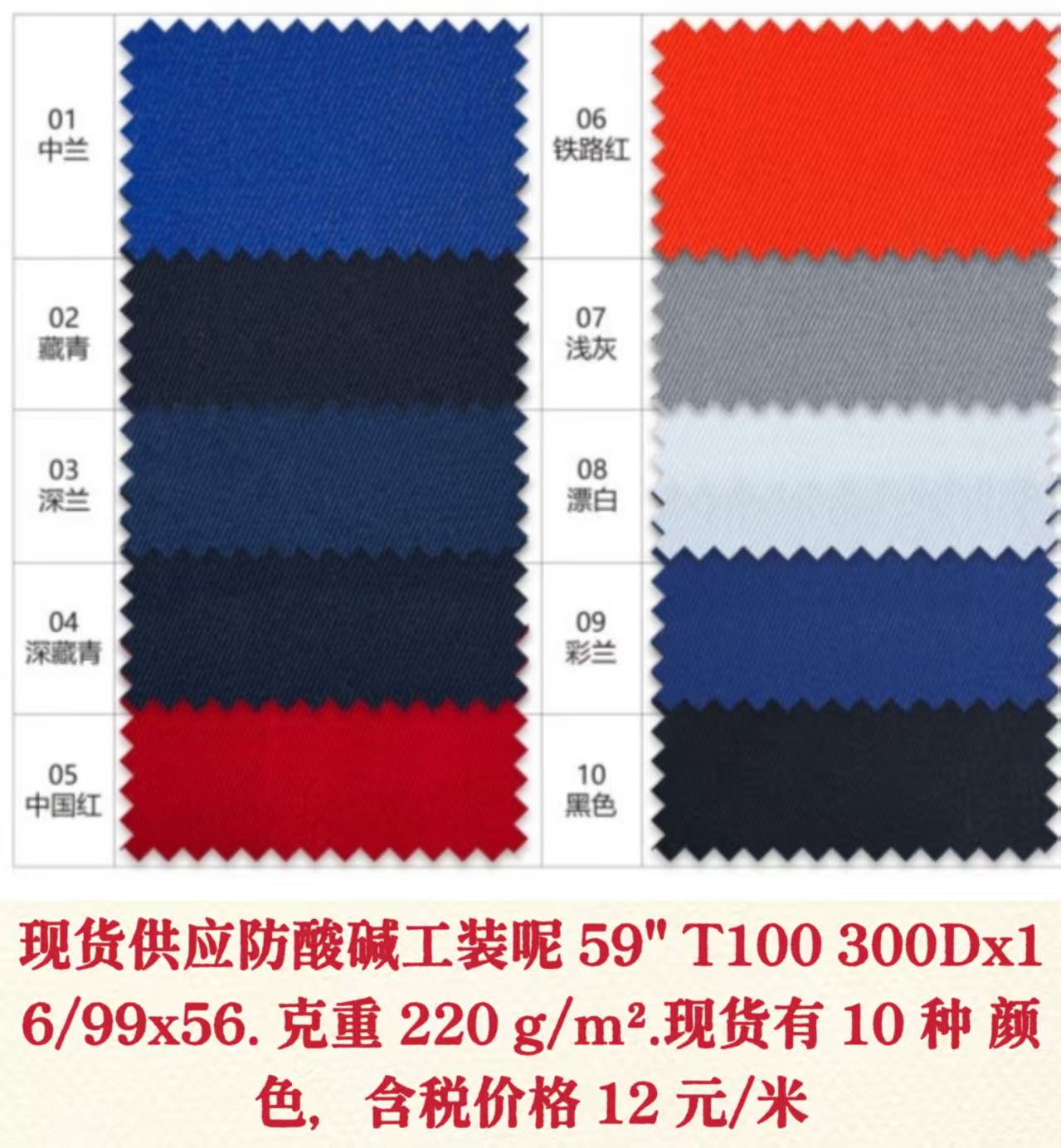 | 产品描述 | 现货供应防酸碱工装呢 59“ T100 300Dx16/99x56. 克重 220 g/m2.现货有 10 种 颜色,含税价格 12 元/米 |