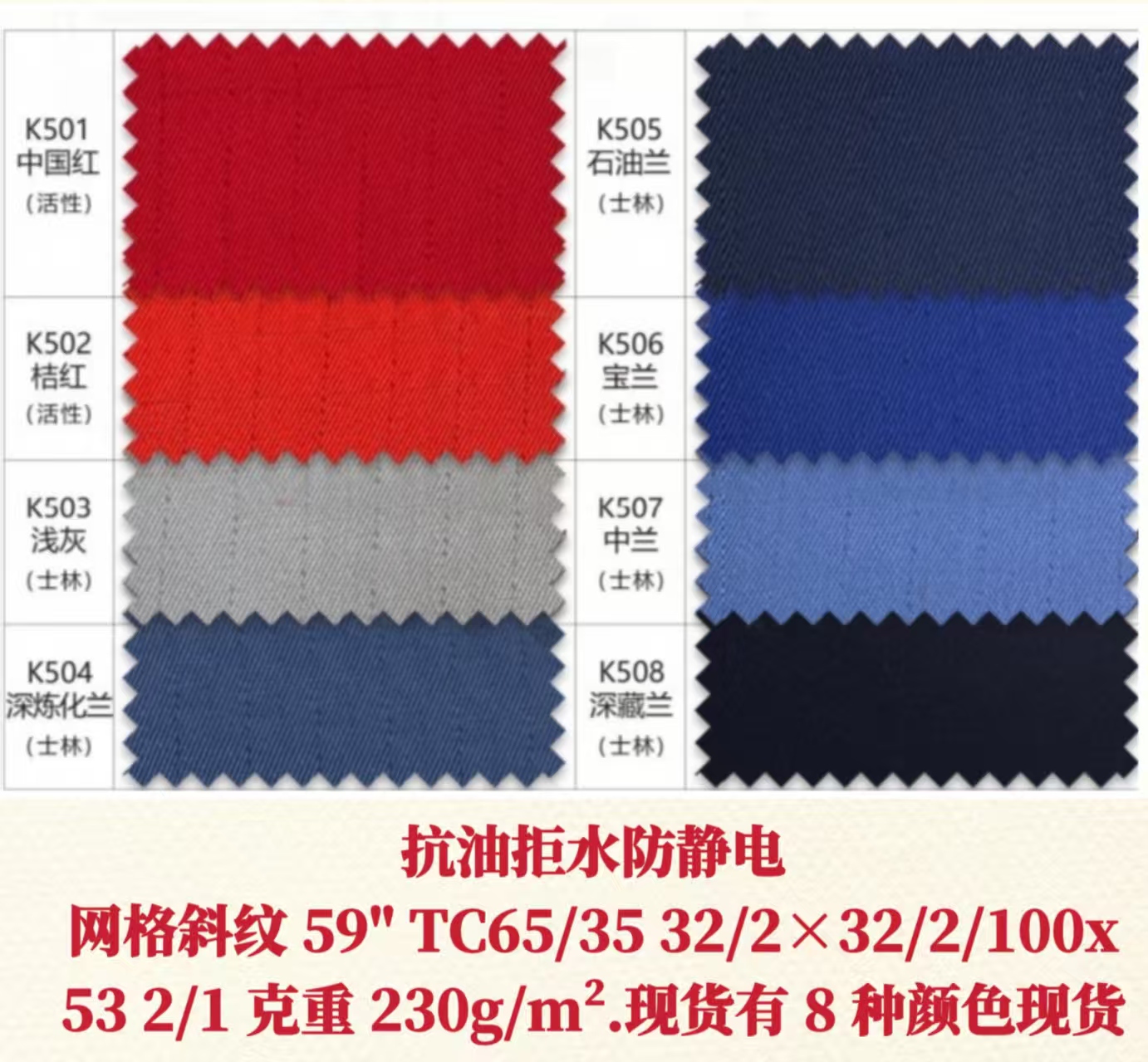 | 产品描述 | 抗油拒水防静电 网格斜纹 59“ TC65/35 32/2×32/2/100x53 2/1 克重 230g/m2.现货有 8 种颜色现货 |