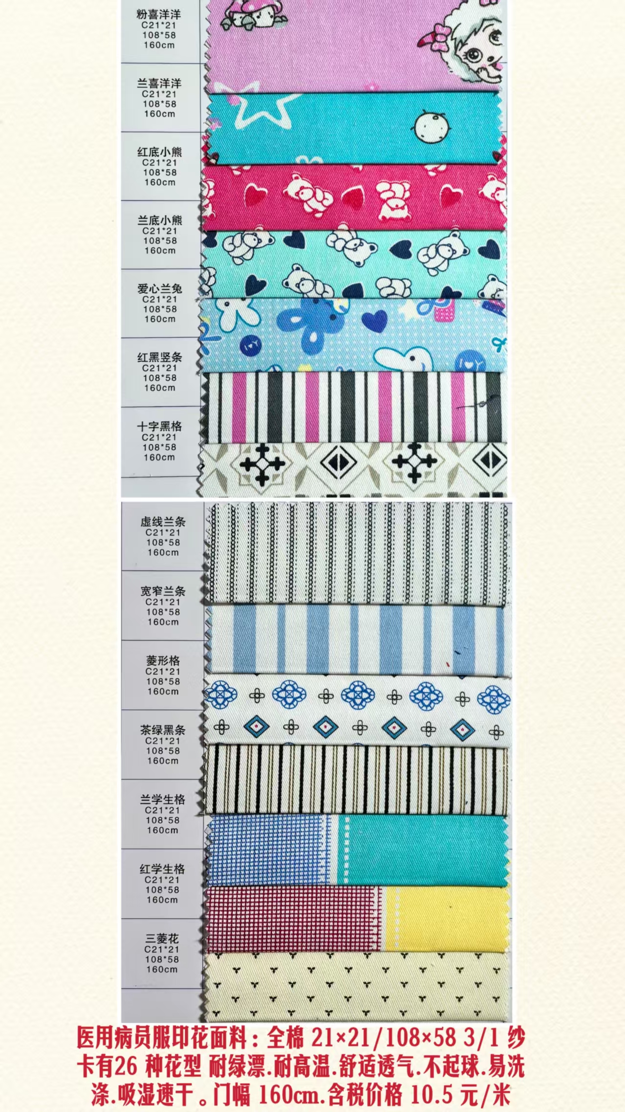 | 产品描述 | 医用病员服印花面料:全棉 21×21/108×58 3/1 纱卡有26 种花型 耐绿漂.耐高温.舒适透气.不起球.易洗涤.吸湿速干。门幅 160cm.含税价格 10.5 元/米 |
