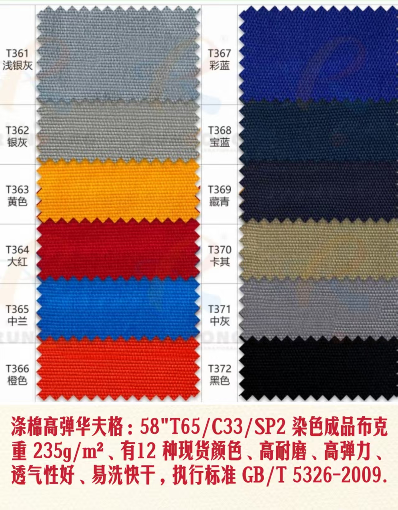 | 备注 | 涤棉高弹华夫格:58“T65/C33/SP2 染色成品布克重 235g/m2、有12 种现货颜色、高耐磨、高弹力 |