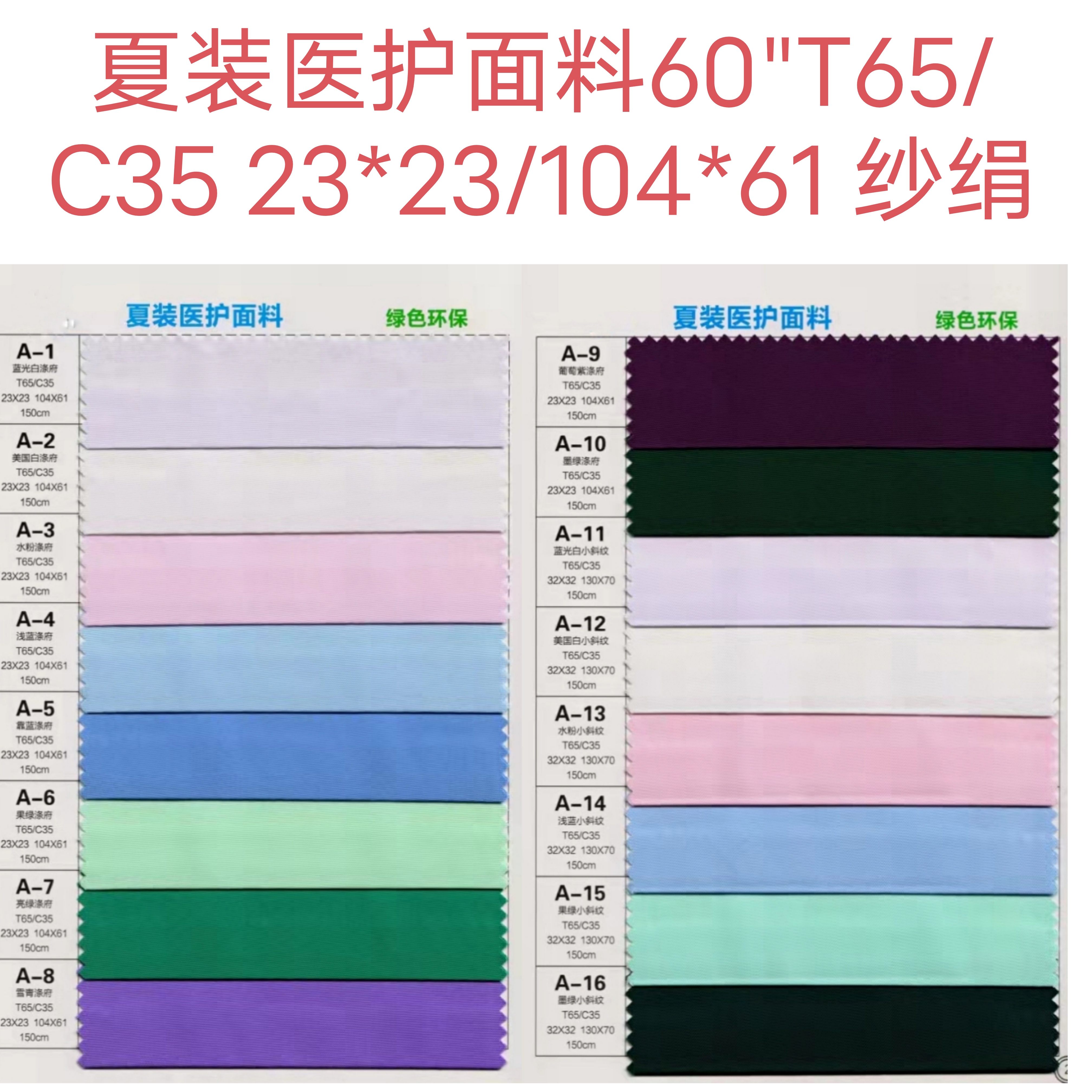 | 产品规格 | 涤棉夏装医护面料58“T65/C35 23×23/104×61 1/1 |