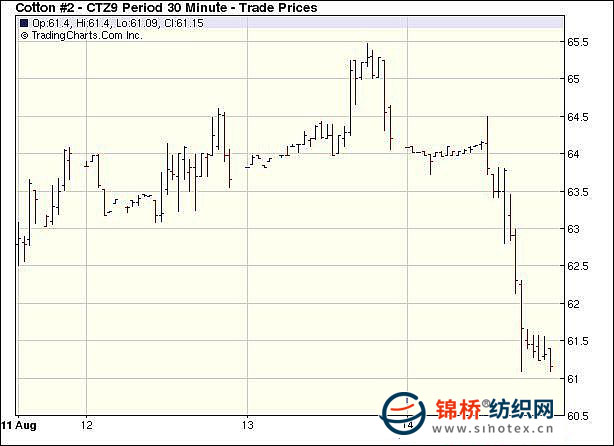 8月14日,外部市场不利走势和本周最后的一天交易“招来”投机商多头清算,致使纽约期棉重创,近期10月合约止于跌停板,结算价59.21美分/磅,0912月合约下跌297点,收于61.12美分,其他合约跌251-288点不等。当日期棉渡过了稳定的开盘和少数几个小时的稳定后暴跌,整个商品市场谷物、能源、金属期货和美国股市下跌、美元走强,给ICE期棉市场予以沉重打击,投机商卖盘“落井下石”,市场最终以触及跌停板收盘。美国8月消费者信心指数从7月份的66.0下降至63.2,不及市场预期。这是自3月以来该指数的最低值,同时也远远低于此前经济学家所平均预期的69.0。该指数报告公布后,美股迅速跳水。