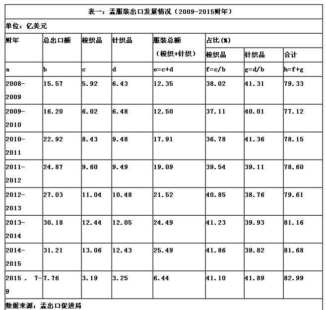 孟加拉为仅次于中国的服装出口大国,2014年孟服装出口额占全球服装出口总额的5.1%(中国居首,占比38.6%,越南第三,占比4%)。服装制造业也是孟支柱产业,全国超过80%的出口收入均来源于此,并且比例逐年提高(见表一)。