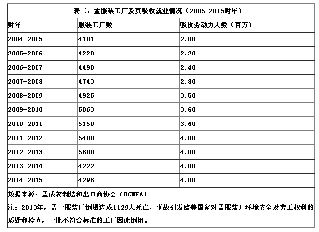 除了作为国家收入的重要来源,服装制造业为劳动密集型产业,在拉动孟就业增长,特别是解决女性就业问题方面发挥着重要作用。据统计,孟目前共有4296家服装厂,吸收了400万劳动力,其中85%为女性(见表二)。