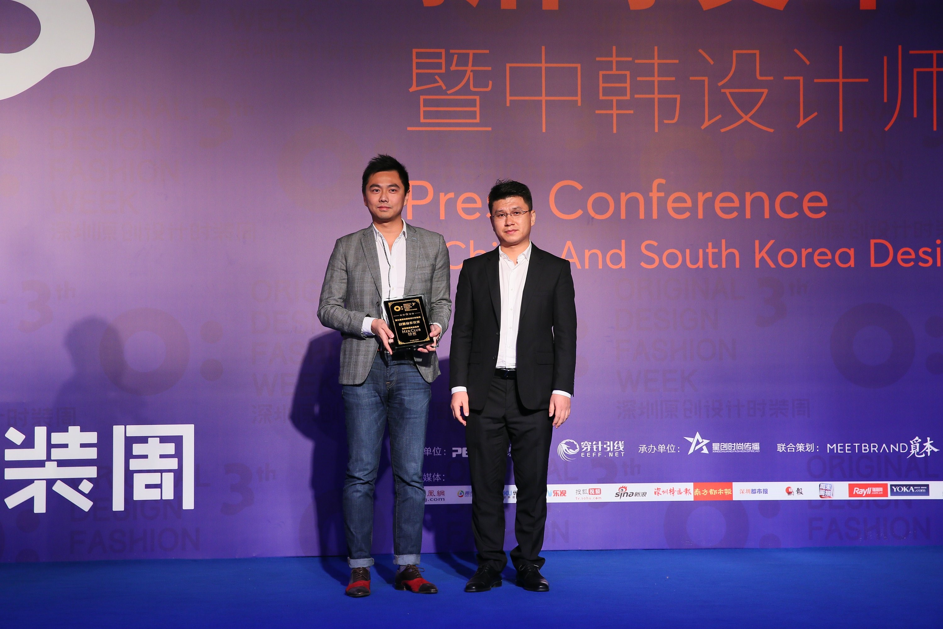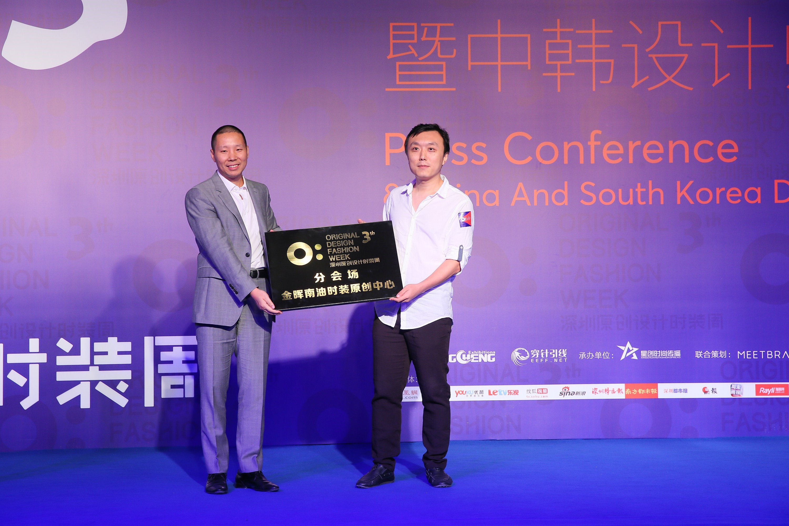 △深圳原创设计时装周组委会秘书长杨春华先生与金晖南油时装周原创中心总经理李丁先生进行时装周南山分会场-金晖南油时装原创中心授牌仪式