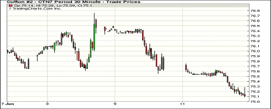 6月12日纽约期棉市场连续收跌,登记库存达到自2014年7月以来最高水平,近期7月合约结算价75.13美分/磅,跌56点;主力12月合约72.44美分,跌5点。当日市场整日交易显疲态,近期7月合约稳定开盘后受投机卖盘打压趋势向下,在75美分处获得支撑,12月合约整日在72.33-72.64美分区间窄幅波动,终市场以下跌收盘。7/12月价差回归到2-3美分之间。