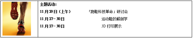 跑鞋一向被视为田径运动员不可或缺的重要装备,一双跑鞋的成功在于不同部件的设计与技术,缺一不可。活动将集结世界各地的鞋面、鞋底、3D打印,甚至智能鞋技术领域的专家,探索运动鞋的最新发展和趋势。