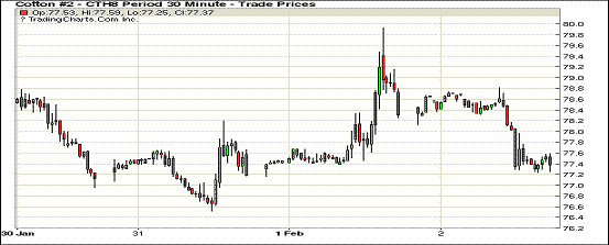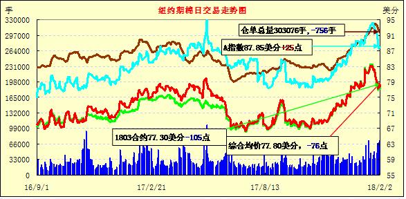 2日纽约期棉市场全面收跌,近月1803合约结算价77.30美分/磅,跌105点,1805合约结算价78.61美分,跌84点,1812合约75.08美分,跌34点。当日3月合约上半场交易围绕78.4-78.8美分之间波动,交易中期遇卖盘打压跌势明显,后道77美分一线止跌,终收于近低点。某大型基金在过去三个日完成3/5月移仓,将有另一基金2月7日开始移仓。据悉,现货市场土耳其和越南近期采购势头较好。