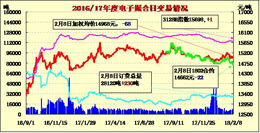 8日电子撮合交易成交量增加,整体合同均价全部收跌,整体合同上涨幅度较小,其中MA805成交量较大,为2920吨;活跃交投的合同多集中于远期合同,整体订货量总量有所增加,其中MA1805订货量最大,累计订货量为7700吨。纽约棉花期货周三收跌,3月合约下跌0.23美分,近期棉价连续受挫,一是受外围市场影响,美三大股指重挫,国际原油大幅下跌,贵金属及CBOT谷物类等大宗商品也表现不佳,市场氛围利空,棉价跟随下行;二是棉价下跌,部分投资者获利了结出场,市场没有新的利好刺激,即使有一些比如出口销售的利好,也难以令棉价有大的反弹幅度。