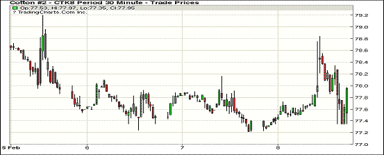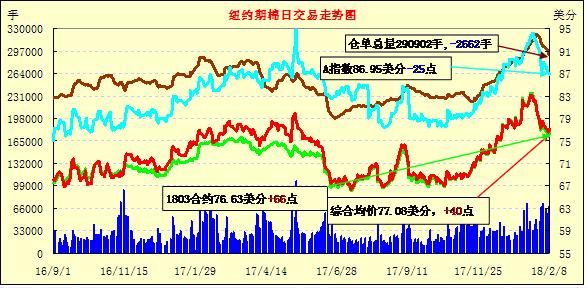 8日纽约期棉市场近月合约收涨,1803合约结算价76.62美分,涨66点;1805合约结算价77.56美分,涨27点;1812合约结算价75.17美分,涨14点。当日5月合约上半场表现波澜不惊,盘中受美棉出口周报利好刺激重心向上一路突破78逼近79美分,交易后期维持震荡,全球供需月报发布后围绕77.4-77.6美分区间波动,最终小幅收涨。据美国农业部(USDA),1.26-2.1日一周美国净签约出口2017/18年度陆地棉91263吨(含新签约97477吨,另取消6214吨前期订单),较前一周增加33%,较近4周平均签约量增加75%;装运2017/18年度陆地棉98089吨,创年度新高,较前周增加42%,较近4周平均增加56%。USDA发布全球供需预测报告,在大幅度调高中国产量、下调印度产量和消费量有所调整后,全球期末库存整体调高。