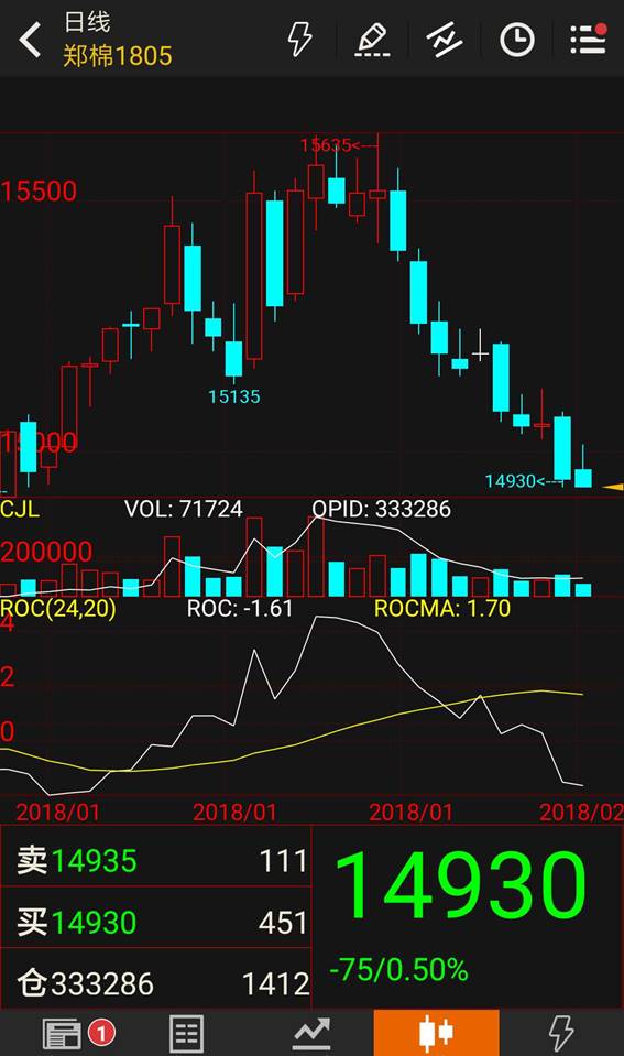 郑棉CF1805合约自2018年1月中旬涨至15635元/吨后,市场人士纷纷对后市抱有期待,奈何市场变幻莫测,令人难以捉摸。近期郑棉行情一路走低,于春节前夕再度跌破万五大关,跌幅超600元/吨。同时ICE期棉也未站稳前期83美分/磅高位,一路下滑至77美分/磅。