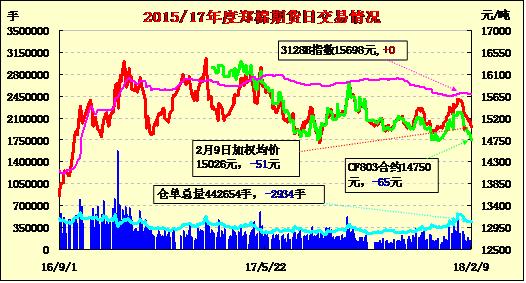 9日隔夜郑棉回升震荡,今日盘中在多头平仓与空头卖盘压制下走低,日线形成阴线。日内成交量萎缩,持仓量减少。基本面情况:棉花市场观望增浓,部分纺企年前备货接近尾声,但表示如果价格下跌仍会适量采购,部分轧花厂节前已经停止收购加工,部分内地轧花厂3128级价格在14500-14600元/吨毛重,一企业疆棉巴楚库3129级强度29报价在15400-15500元/吨公定,整体实单商谈均有优惠空间,随着春节长假的临近,多数厂家逐步准备放假事宜,据调查93%的下游企业将在10日左右即将放假,即本周六左右,目前部分外地员工已逐步休假归乡。印度S-6轧花厂提货价再次出现下跌,报39900卢比/坎地,约折79.2美分/磅,新花日上市量在2.92万吨,环比缩减0.45万吨。