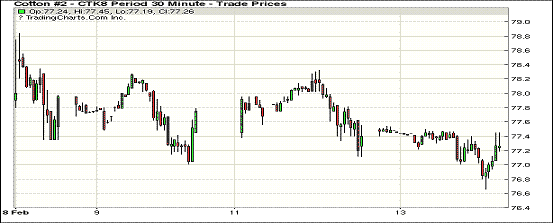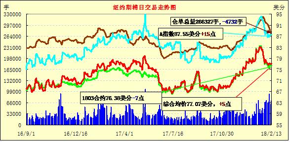 13日纽约期棉市场继续以近跌远涨收盘,近月1803合约结算价76.38美分,跌7点;1805合约结算价77.40美分,跌5点;1807合约结算价78.42美分,跌2点;1812合约结算价75.87美分,涨13点;2019年度合约上涨14-31点不等。当日5月合约上半场交易平淡,盘中重心向上突破77.5美分,后因卖盘打压调头向下。跌破76.7美分之后触发买盘,市场反弹,但上涨动力不足,最终小幅收跌。NCC10日发布的植棉面积预期对近几日期棉市场影响有限,有分析师表示1307.8万英亩低于市场预期。外围美元指数下跌,小麦期货下跌,玉米和大豆期货收涨。