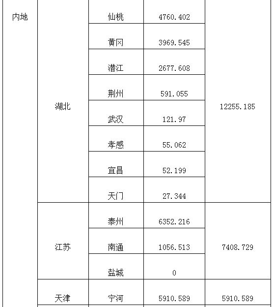 内地累计加217498.726吨;山东企业108487.277吨,河北企业43262.508吨,甘肃企业38123.536吨,湖北企业12255.185吨,江苏企业7408.729吨,天津企业5910.589吨,安徽企业1280.943吨,湖南企业319.264吨。