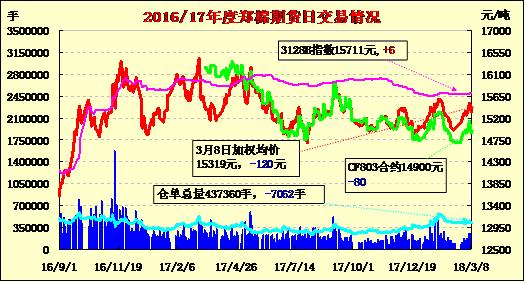 8日隔夜郑棉盘整,今日早盘延续横盘走势,午后在平仓盘打压下快速下探,随后在空头回补支撑下脱离低点,日线形成阴线。日内成交量略有萎缩,持仓量减少。基本面情况:棉花现货心态一般,观望略占主导,新疆库南疆手摘长度28/29强度26/27报价在15450-15650元/吨公定,新疆库3128/29级强度28/29级报价在16000-16100元/吨毛重,新疆机采棉山东河北库报价在15850-15950元/吨毛重。长绒棉市场相对维持稳定,成交一般,137级到厂价维持在25200元/吨左右,237级在24600元/吨到厂。目前纺企开工基本恢复,多使用节前采购资源,零星有1-2批采购补货,多等待抛储。