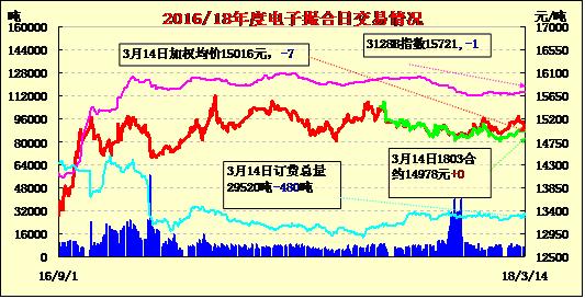 14日电子撮合交易成交量减少,合同均价多数收跌。其中MA1808成交量较大,为1710吨;活跃交投的合同多集中于远期合同,其中MA1806订货量最大,累计订货量为7380吨。纽约期棉主力5月合约小幅低开,开盘后围绕83.19一线小幅震荡,后买盘入场受支撑向上,但在突破84美分后受获利了结盘打压市场下行,该合约试图稳定在83美分之上失败,交易后期受卖盘打压跌破83美分之后短暂跌至82美分,最终小幅收跌。
