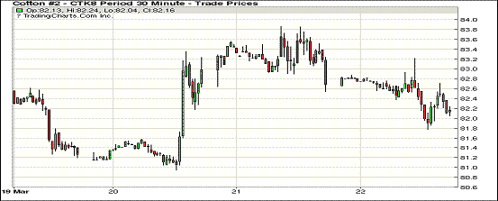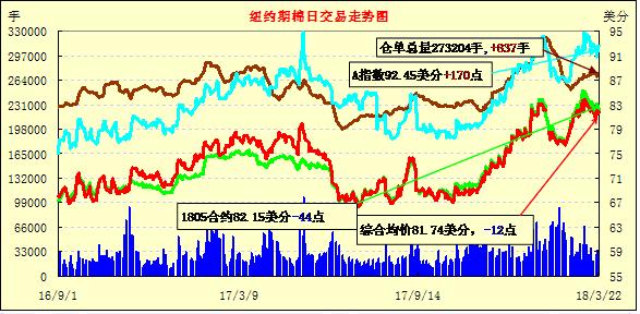 22日纽约期棉市场近跌远涨,1805合约结算价82.15美分,跌44点;1807合约结算价82.40美分,跌39点;1812合约结算价78.00美分,跌5点;1903合约结算价78.13美分,跌6点。当日5月合约小幅高开,开盘后在82-83美分区间震荡运行,后受买盘支撑交易重心向上突破83美分至当日高点83.21美分,高点卖盘入场市场承压走低,跌破82美分之后低点买盘发力,但因上涨动力不足,最终小幅收跌。21日美联储宣布加息之后,近月合约应声下跌,昨日延续下跌走势。由于华盛顿天气原因,USDA美棉出口周报将推迟一天发布。外围美元指数上涨,玉米和小麦期货上涨,大豆期货下跌。