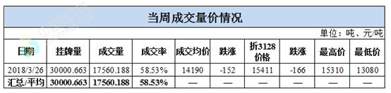 累计情况:截至3月26日,累计计划出库33万吨,累计出库成交21.91万吨,成交率为66.35%;成交最高价16310元/吨,最低价12940元/吨。