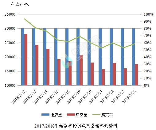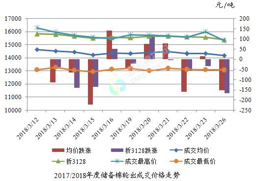 3月26日储备棉轮出销售资源30000.663吨,实际成交17560.188吨,成交率58.53%。平均成交价格14190元/吨(较前一日下跌152元/吨);折3128价格15411元/吨(较前一日下跌166元/吨)。