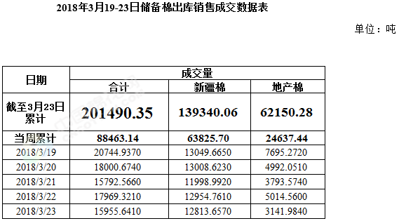 上周(2018年3月19日-23日),2017/18年度储备棉轮出第二周,中国储备棉管理有限公司计划出库销售储备棉15.01万吨,实际成交8.85万吨,成交率58.95%,其中新疆棉成交6.38万吨,成交率100%,地产棉成交2.46万吨,成交率28.57%。从成交价格看,成交平均价14375元/吨,折标准级(3128)价格15612元/吨,其中新疆棉成交均价14565元/吨,平均加价625元/吨;地产棉成交均价13865元/吨,平均加价145元/吨。