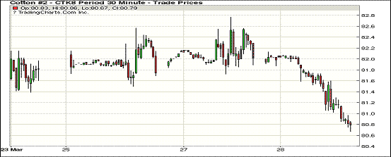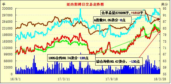 28日纽约期棉市场近月合约大幅收跌。1805合约结算价80.74美分,跌128点;1807合约结算价81.18美分,跌126点;1812合约结算价76.99美分,跌63点;1903合约结算价77.23美分,跌57点。当日5月合约低开低走,开盘后在围绕82美分一线震荡运行,后卖盘入场市场下行,盘中虽有几次回升,但因上涨动力不足交易重心整体一路向下,最终以80.74美分大幅收跌,为2月22日以来的最低点。当下市场普遍关注点主要有:USDA即将发布的美棉出口周报2018/19种植意向报告,德州地区旱情,以及中美贸易战的后续发展。某大型多头基金开始往7月移仓,将持续至4月2日。USDA将德州地区60个郡划分为干旱灾区,据悉拉伯克地区终于迎来期待已久的降雨,将缓解当地旱情,利于棉农备耕。外围美元指数上涨,玉米期货上涨,大豆和小麦期货下跌。