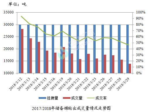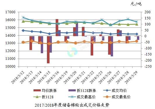 3月29日储备棉轮出销售资源30000.335吨,实际成交13878.114吨,成交率46.26%。平均成交价格14189元/吨(较前一日上涨2元/吨);折3128价格15452元/吨(较前一日上涨22元/吨)。