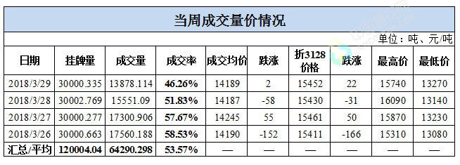 累计情况:截至3月29日,累计计划出库42.01万吨,累计出库成交26.58万吨,成交率为63.26%;成交最高价16310元/吨,最低价12940元/吨。