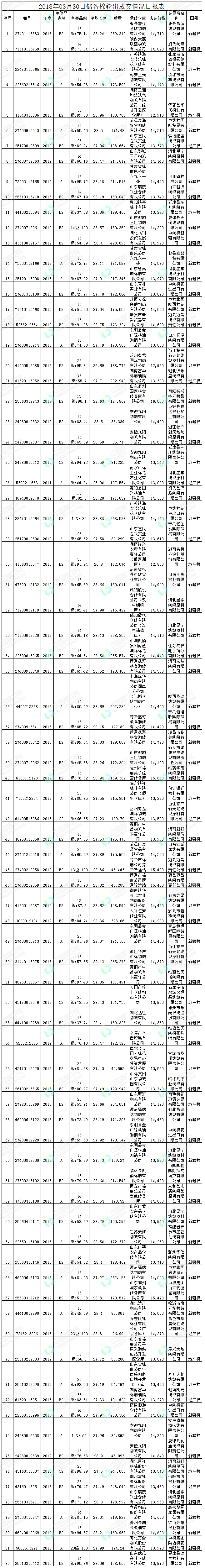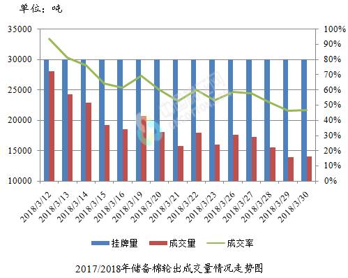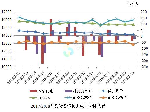 3月30日储备棉轮出销售资源30000.079吨,实际成交14005.458吨,成交率46.68%。平均成交价格14153元/吨(较前一日下跌36元/吨);折3128价格15432元/吨(较前一日下跌20元/吨)。