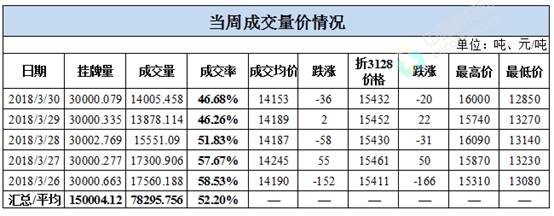 累计情况:截至3月30日,累计计划出库45.01万吨,累计出库成交27.98万吨,成交率为62.15%;成交最高价16310元/吨,最低价12850元/吨。
