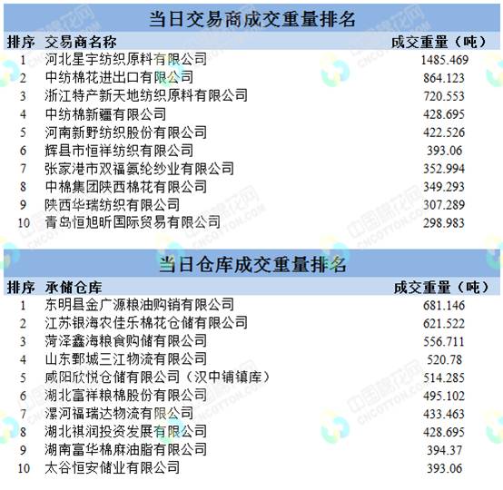 地产棉成交3747.401吨,成交率18.98%,成交均价13552元/吨,平均加价226元/吨,最高成交价14440元/吨,最低成交价12850元/吨;新疆棉成交10258.057吨,成交率100%,成交均价14373元/吨,平均加价490元/吨,最高成交价16000元/吨,最低成交价13710元/吨。