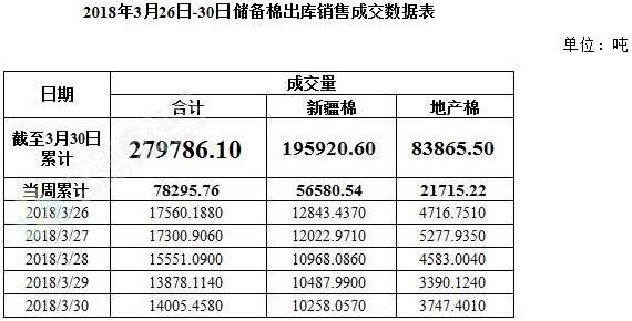 截至2018年3月30日,2017/2018年度储备棉轮出累计挂牌45.01万吨,累计成交27.98万吨,成交率62%,其中新疆棉挂牌19.59万吨,成交率99.97%,地产棉8.39万吨,成交率33%;累计成交企业399家,纺织企业成交14.46万吨,占比52%;贸易商成交13.52万吨,占比48%。