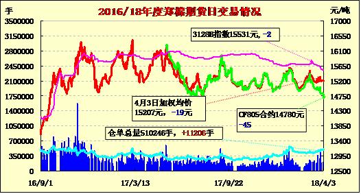 3日隔夜郑棉盘整后盘整,今日早盘探低回升后上冲,随后下滑,日线形成长阴线星。日内成交量放大,持仓量继增加。基本面情况:棉花现货市场调整观望,部分企业为了方便而减少拍储量,从贸易商处购买,新棉现货市场也略显有价无市,河南地产2227级报14200元/吨。而新疆棉纺织暂停在建及拟建项目的消息传出,市场也均关注后续情况,猜测或对在建项目的企业将造成较大损失,关注后续发展。