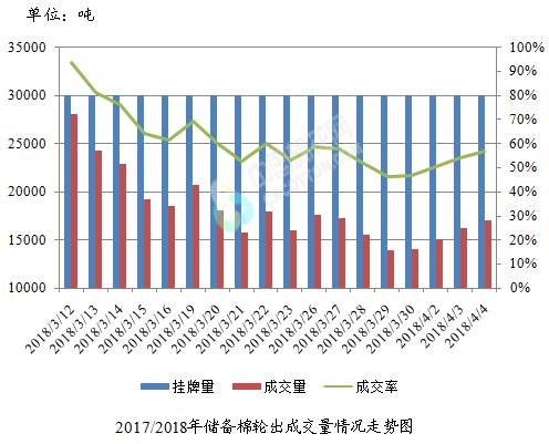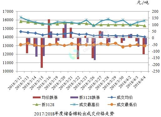 4月4日储备棉轮出销售资源30002.18吨,实际成交16997.928吨,成交率56.66%。平均成交价格14035元/吨(较前一日下跌120元/吨);折3128价格15349元/吨(较前一日下跌49元/吨)。