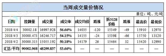 累计情况:截至4月4日,累计计划出库54.01万吨,累计出库成交32.81万吨,成交率为60.74%;成交最高价16310元/吨,最低价12850元/吨。