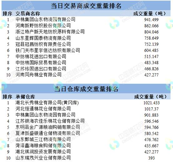 地产棉成交7429.178吨,成交率36.36%,成交均价13676元/吨,平均加价107元/吨,最高成交价15030元/吨,最低成交价12970元/吨;新疆棉成交9568.75吨,成交率100%,成交均价14314元/吨,平均加价675元/吨,最高成交价15910元/吨,最低成交价13520元/吨。
