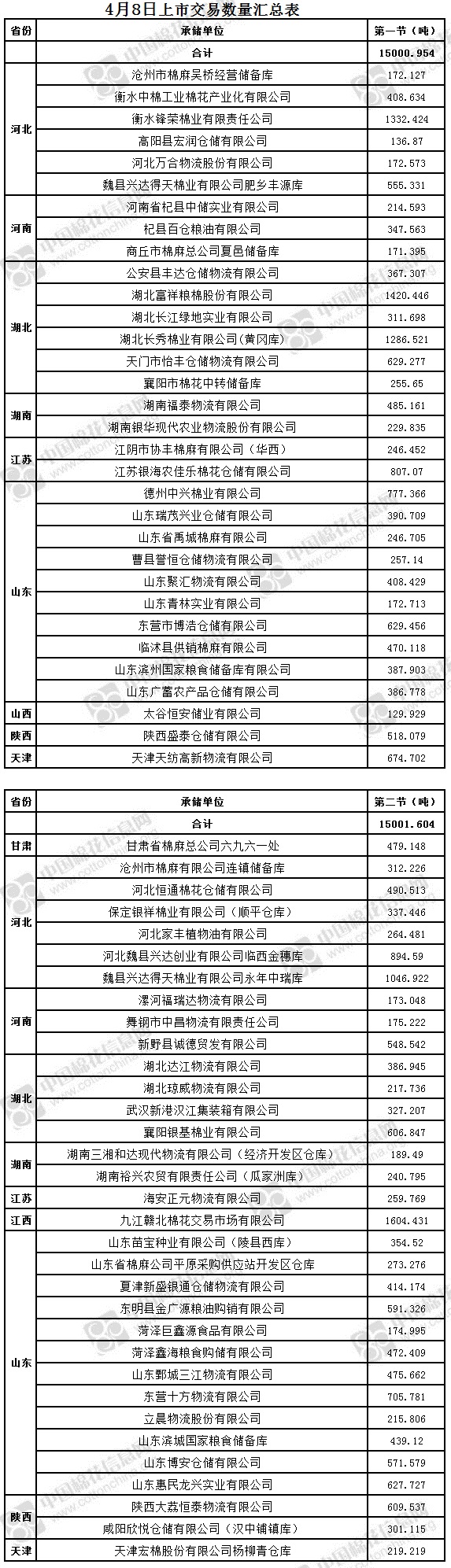 4月8日两节共计轮出储备棉30002.558吨。第一节销售储备棉15000.954吨,其中需要倒垛出库73捆。第二节销售储备棉15001.604吨,其中需要倒垛出库86捆。