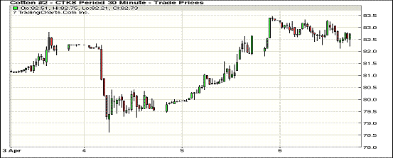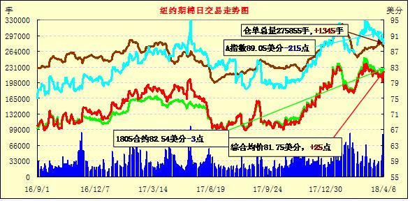6日纽约期棉市场基本收平,近月1805合约结算价82.54美分/磅,跌3点,1807合约结算价82.18美分,涨3点,1812合约77.94美分,涨7点。当日5月合约高开,市场整日交易多围绕83美分波动,交易后期回归82.5美分一线波动,终以微跌收盘。中美贸易战持续,中国对美棉进口拟加征25%关税,市场关注后续影响。美国德州持续干旱,短期内尚无降雨预期,对市场形成支持。