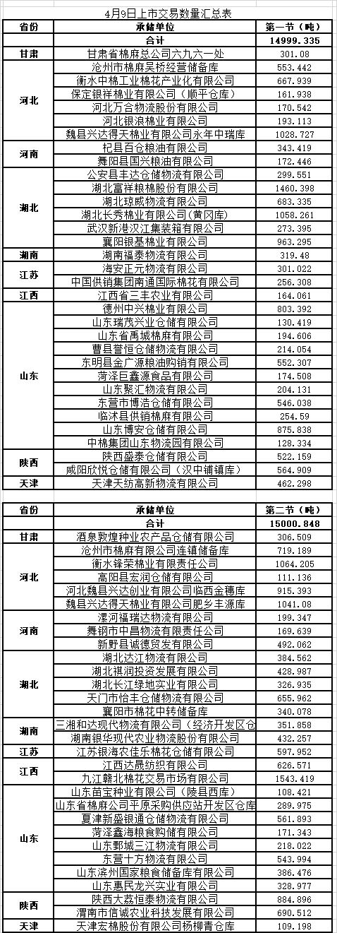 4月9日两节共计轮出储备棉30000.183吨。第一节销售储备棉14999.335吨,其中需要倒垛出库76捆。第二节销售储备棉15000.848吨,其中需要倒垛出库77捆。