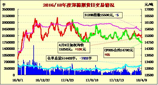 | CF805 | 14780 | 14870 | 14755 | 14795 | 14790 | 65 | 22360 | -25094 | 13711074 | 130808 | -5908 |