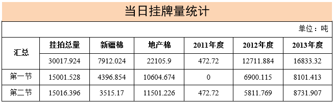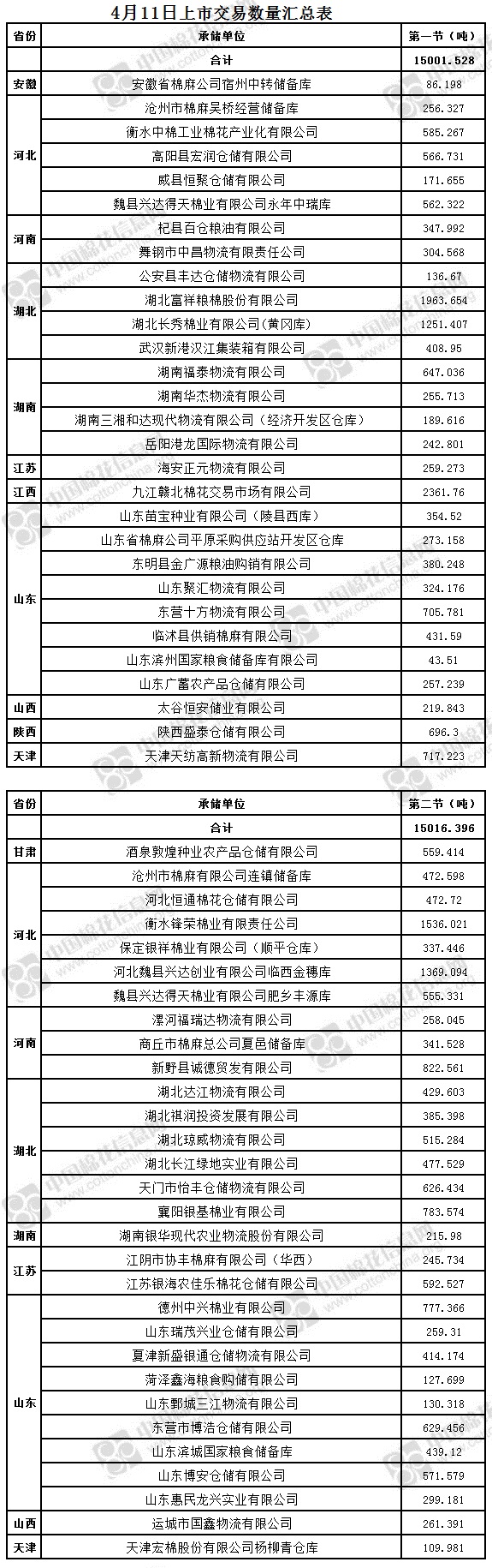 4月11日两节共计轮出储备棉30017.924吨。第一节销售储备棉15001.528吨,其中需要倒垛出库97捆。第二节销售储备棉15016.396吨,其中需要倒垛出库70捆。