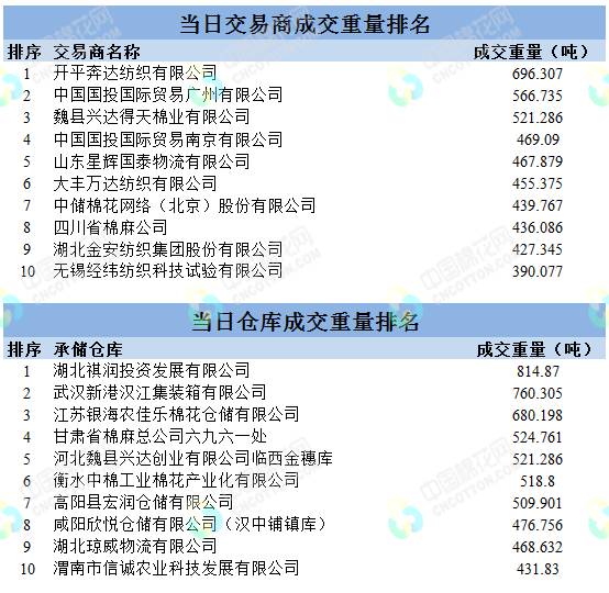 地产棉成交5022.965吨,成交率23.21%,成交均价13792元/吨,平均加价147元/吨,最高成交价15090元/吨,最低成交价12830元/吨;新疆棉成交8390.292吨,成交率100%,成交均价14424元/吨,平均加价690元/吨,最高成交价14920元/吨,最低成交价13620元/吨。