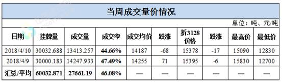 累计情况:截至4月10日,累计计划出库63万吨,累计出库成交37.18万吨,成交率为59%;成交最高价16310元/吨,最低价12700元/吨。