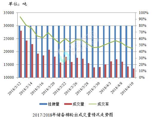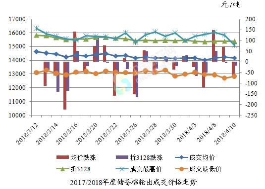4月10日储备棉轮出销售资源30032.688吨,实际成交13413.257吨,成交率44.66%。平均成交价格14187元/吨(较前一日下跌68元/吨);折3128价格15378元/吨(较前一日下跌17元/吨)。