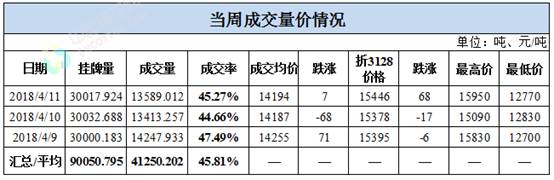 累计情况:截至4月11日,累计计划出库66万吨,累计出库成交38.5万吨,成交率为58%;成交最高价16310元/吨,最低价12700元/吨。