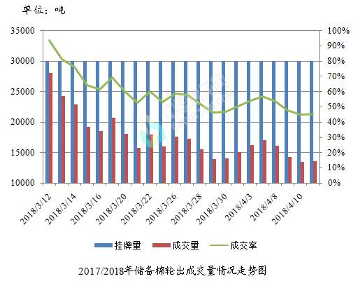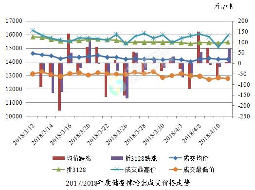 4月11日储备棉轮出销售资源30017.924吨,实际成交13589.012吨,成交率45.27%。平均成交价格14194元/吨(较前一日上涨7元/吨);折3128价格15446元/吨(较前一日上涨68元/吨)。