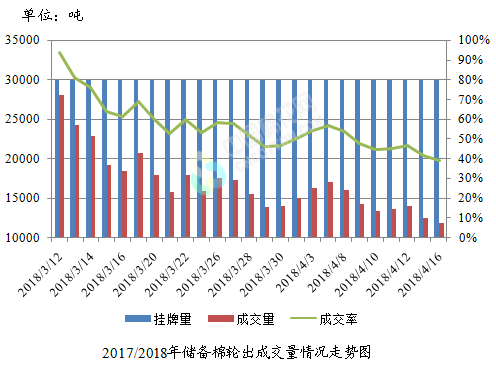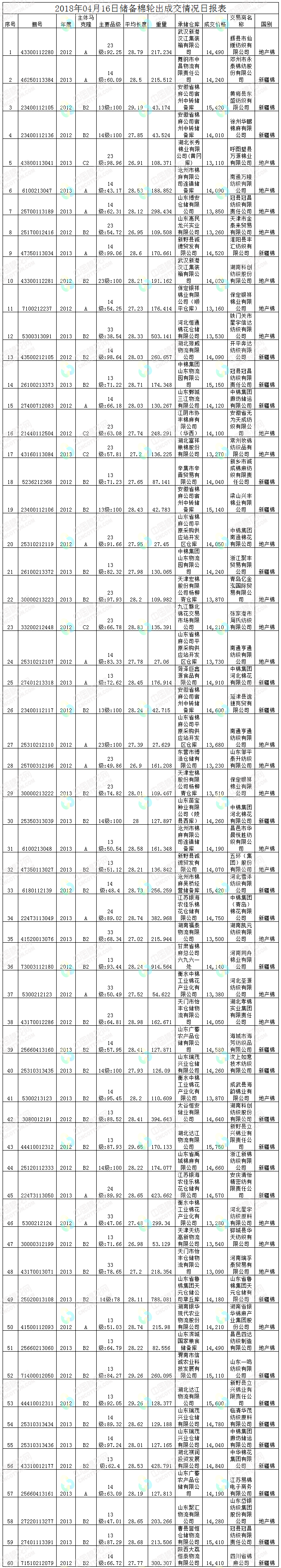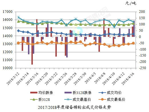 4月16日储备棉轮出销售资源30014.488吨,实际成交11809.728吨,成交率39.35%。平均成交价格14250元/吨(较前一日上涨81元/吨);折3128价格15574元/吨(较前一日上涨128元/吨)。