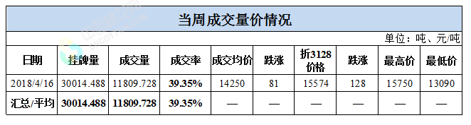 累计情况:截至4月16日,累计计划出库75万吨,累计出库成交42万吨,成交率为56%;成交最高价16310元/吨,最低价12700元/吨。