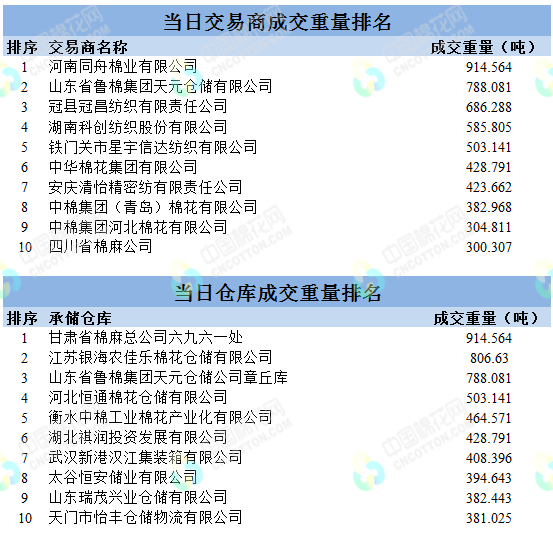 地产棉成交4690.48吨,成交率23.6%,成交均价13758元/吨,平均加价153元/吨,最高成交价14490元/吨,最低成交价13090元/吨;新疆棉成交7119.248吨,成交率100%,成交均价14574元/吨,平均加价800元/吨,最高成交价15750元/吨,最低成交价14010元/吨。