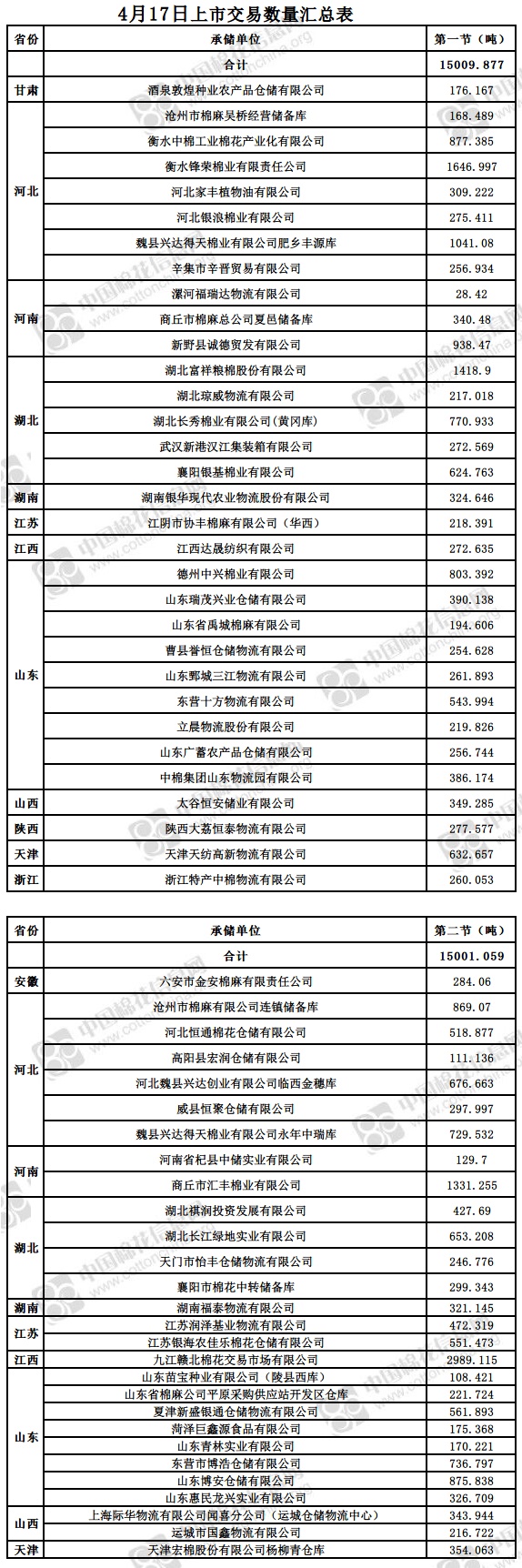 4月17日两节共计轮出储备棉30010.936吨。第一节销售储备棉15009.877吨,其中需要倒垛出库77捆。第二节销售储备棉15001.059吨,其中需要倒垛出库82捆。